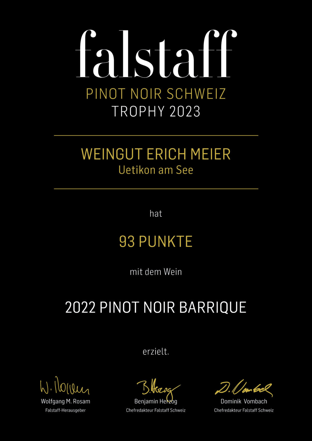 Wir sind stolz, dass unser Pinot Noir Barrique 2022 mit 93 Punkten bewertet wurde.