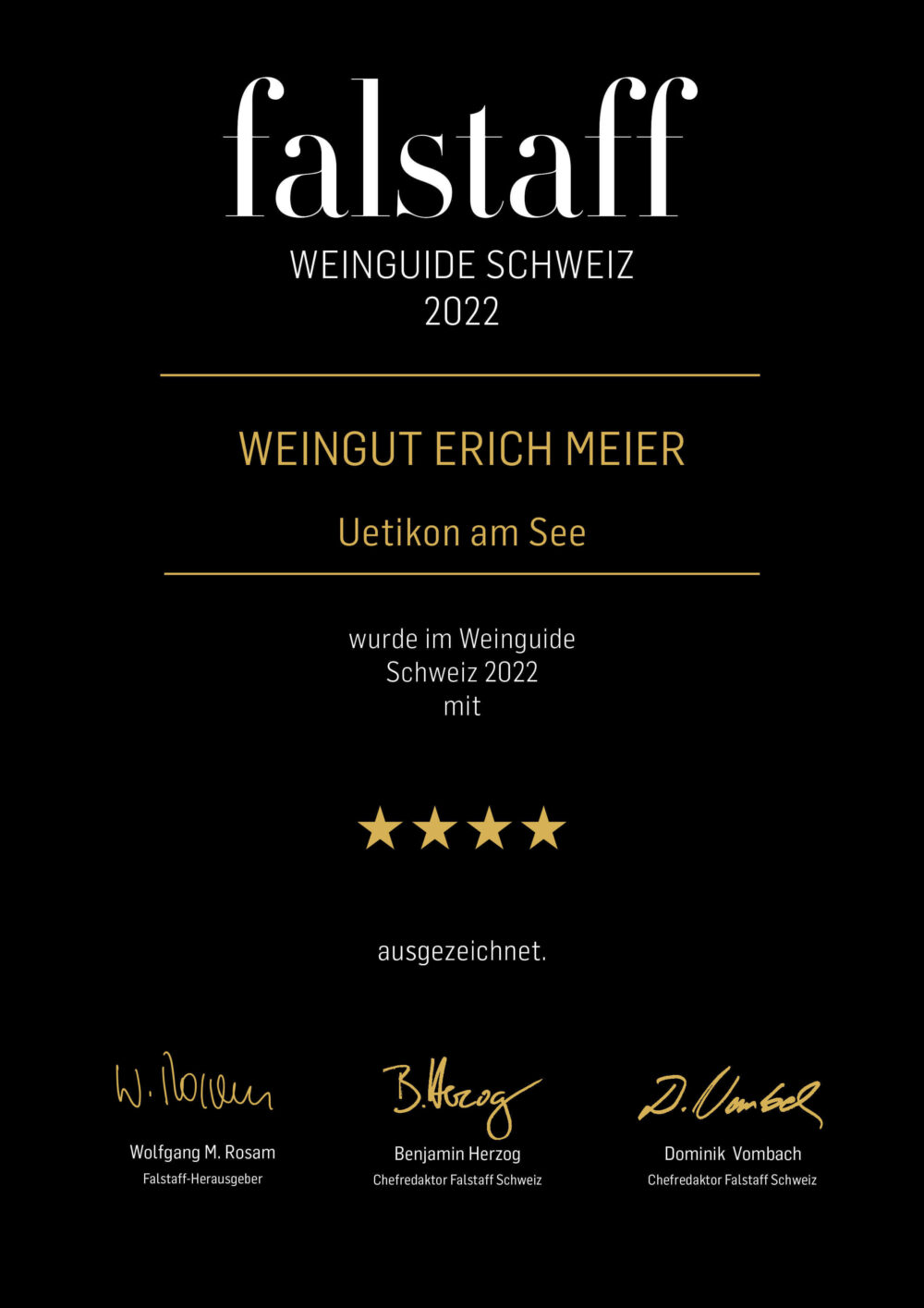 Das Fachmagazin Falstaff hat das Weingut Erich Meier im Weinguide Schweiz 2022 mit 4 Sternen ausgezeichnet. Besten Dank!